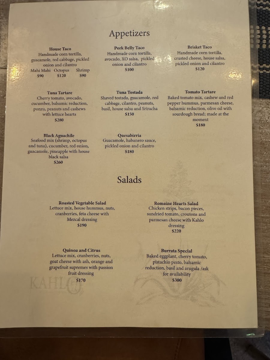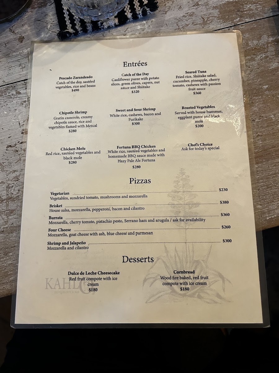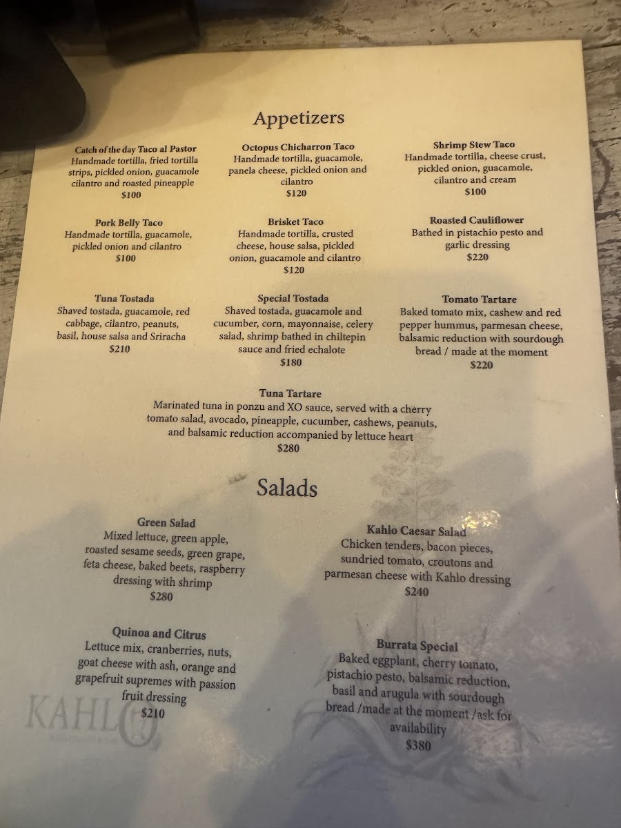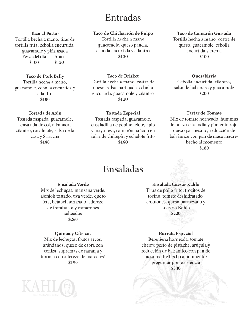 The menu at Kahlo Restaurante & Bar features a variety of Mexican-inspired dishes alongside selections that reflect broader culinary influences. Food offerings include traditional and creative options such as tacos, tostadas, pizzas, and several main courses that incorporate regional flavors. Desserts and snacks complement the meal choices, providing a range of sweet options.