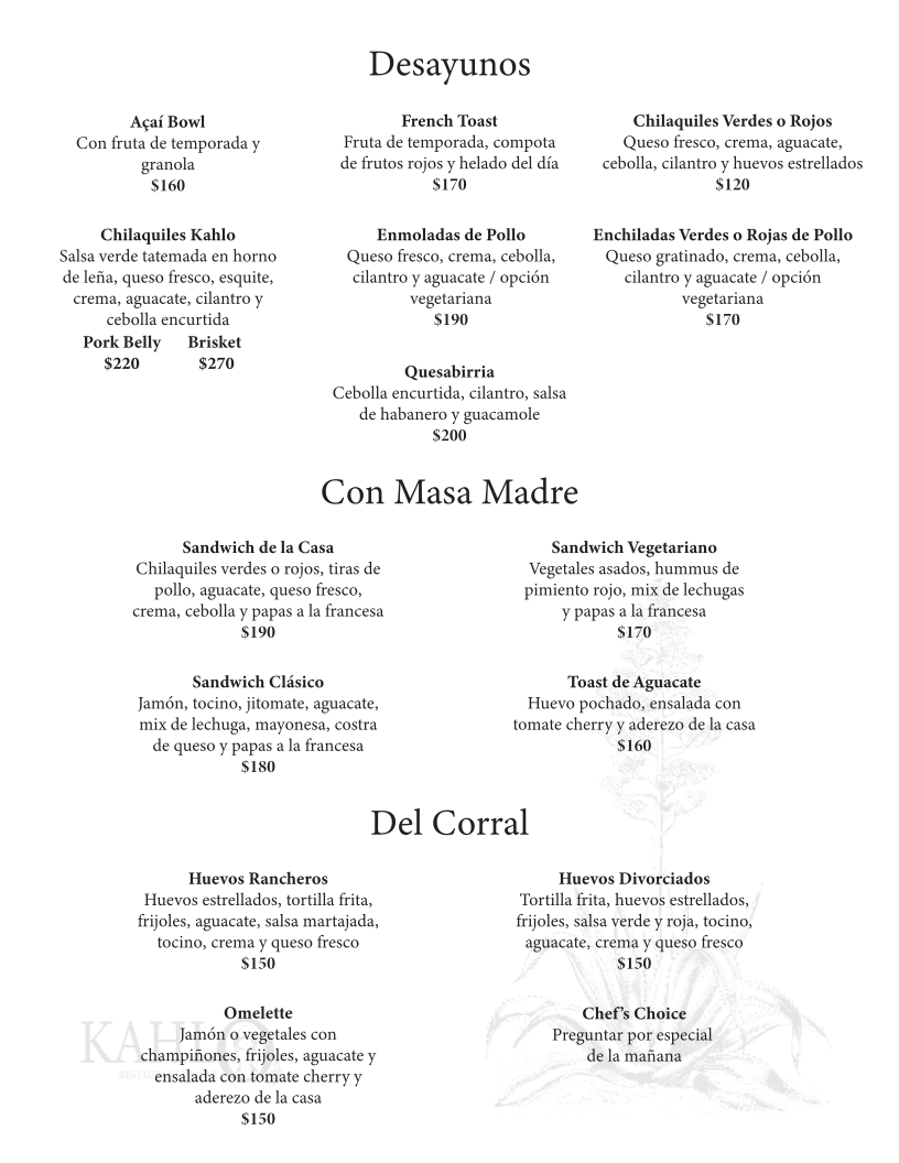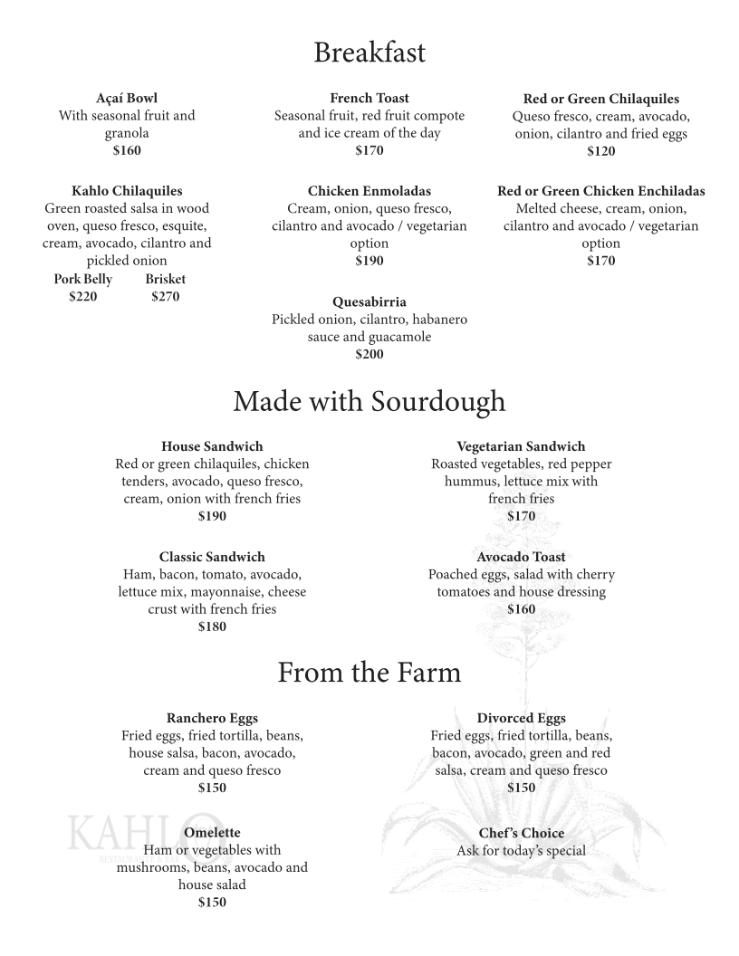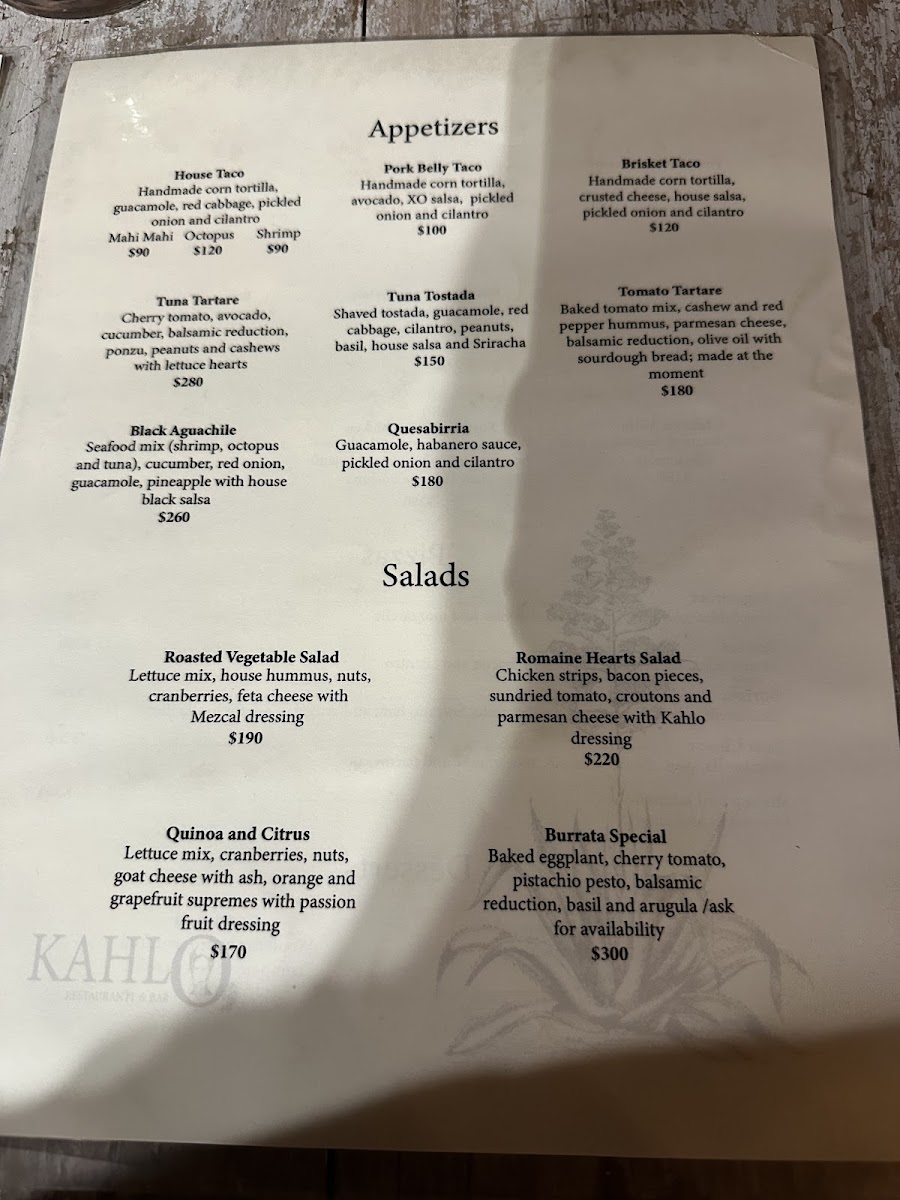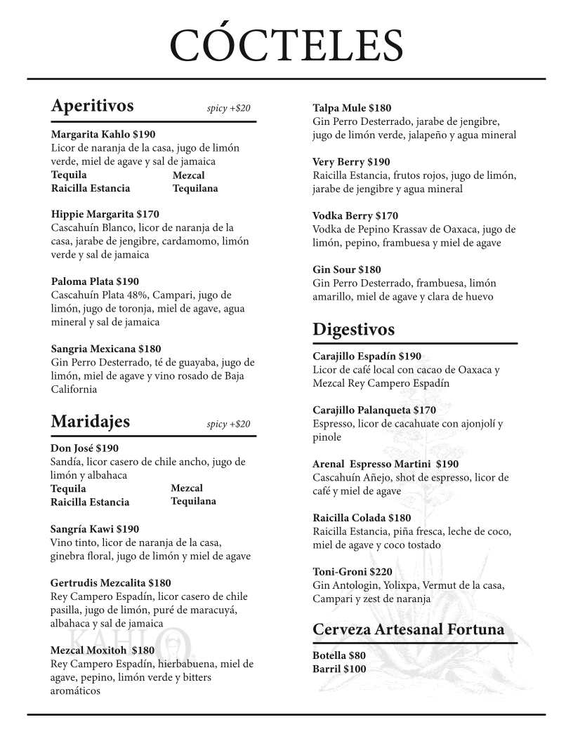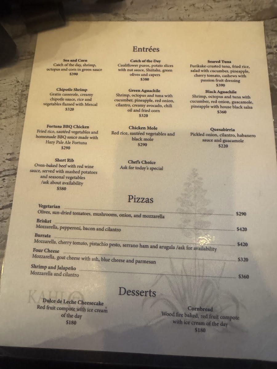 The menu at Kahlo Restaurante & Bar features a variety of Mexican-inspired dishes alongside selections that reflect broader culinary influences. Food offerings include traditional and creative options such as tacos, tostadas, pizzas, and several main courses that incorporate regional flavors. Desserts and snacks complement the meal choices, providing a range of sweet options.